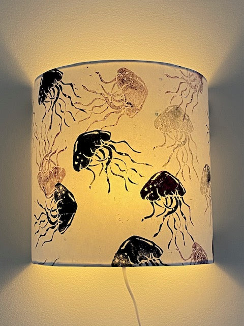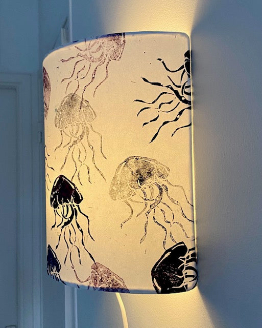 Cette applique a été réalisée à partir d'un papier japonais uni crème sur lequel ont été imprimés à l'encre des motifs de méduses préalablement gravés dans une plaque de lino (technique de linogravure). Cette pièce est unique et réalisée à la main de façon artisanale c'est pourquoi les motifs peuvent présenter de légères irrégularités et le papier de petites traces d'encre qui ajoutent au charme de ce produit.