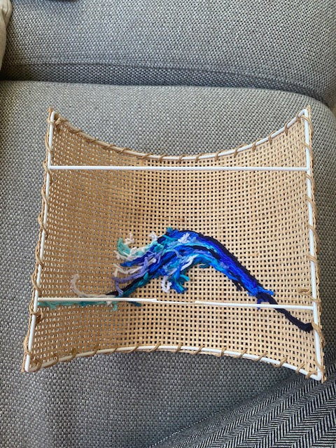 Applique en tissage de rotin naturel rehaussé d'un motif de vague en broderie de laine colorée, le tout réalisé minutieusement à la main. A installer sur une sortie électrique murale simplement grâce à une barre métallique à suspendre sur deux petits clous ou crochets (non fournis).