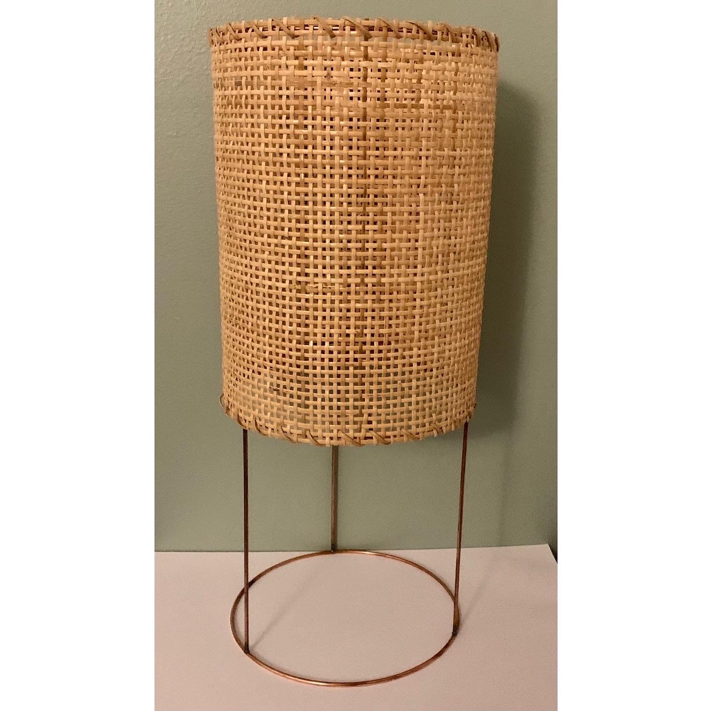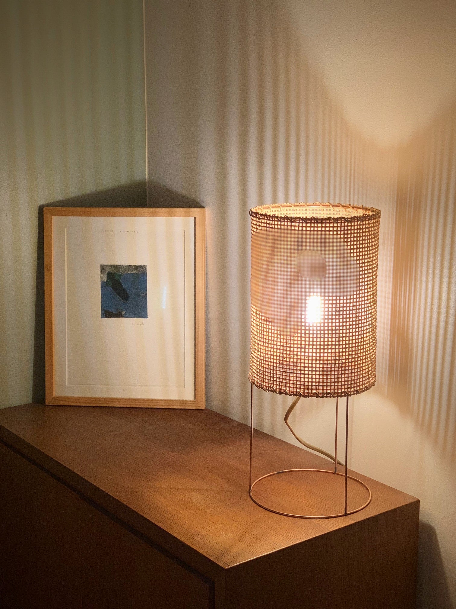 Lampe à poser, piètement en cuivre, abat-jour fixe en tissage de rotin naturel.